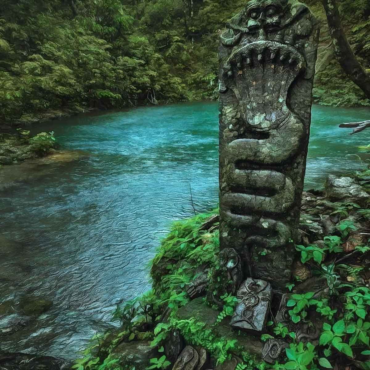 The divine Nagas, shown swimming in the river as Ganga descends, are depicted in an anthropomorphic form, combining the characteristics of serpents and humans